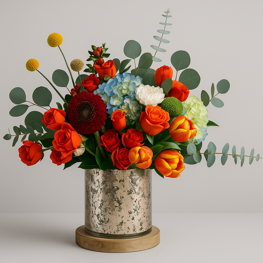 A bold and artistic floral display combining fiery orange tulips and roses with contrasting sky-blue hydrangeas, deep burgundy gerberas, and bright green button mums. Accents of yellow billy balls and rounded eucalyptus leaves add height and texture. The arrangement is presented in a rustic mirrored cylindrical vase with a wooden base, giving it a contemporary yet earthy charm.