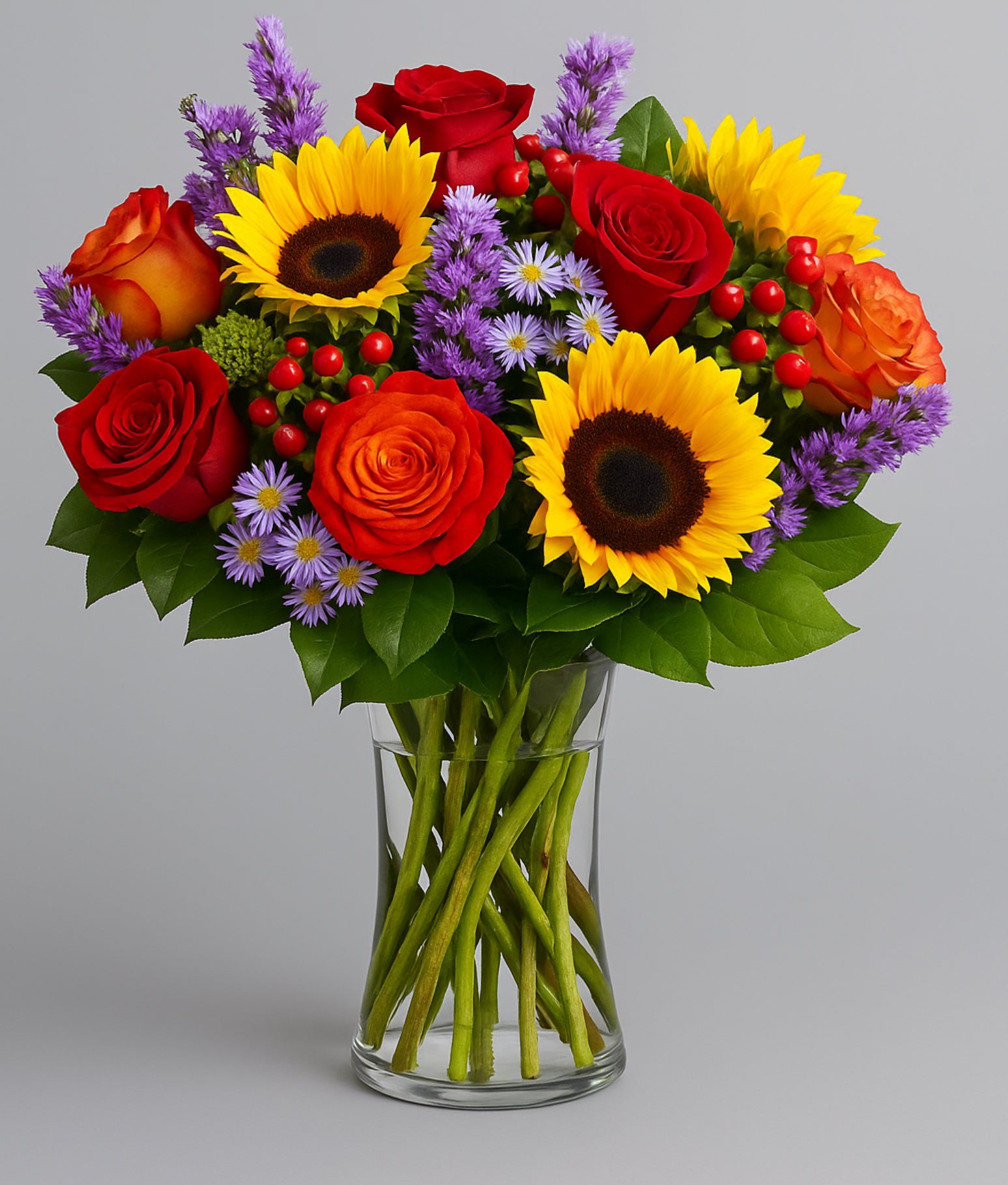 A stunning and energetic bouquet featuring golden sunflowers, fiery orange and red roses, purple aster and liatris blooms, bright red hypericum berries, and fresh greenery. This vibrant composition bursts with joy and warmth, arranged in a clear hourglass vase.