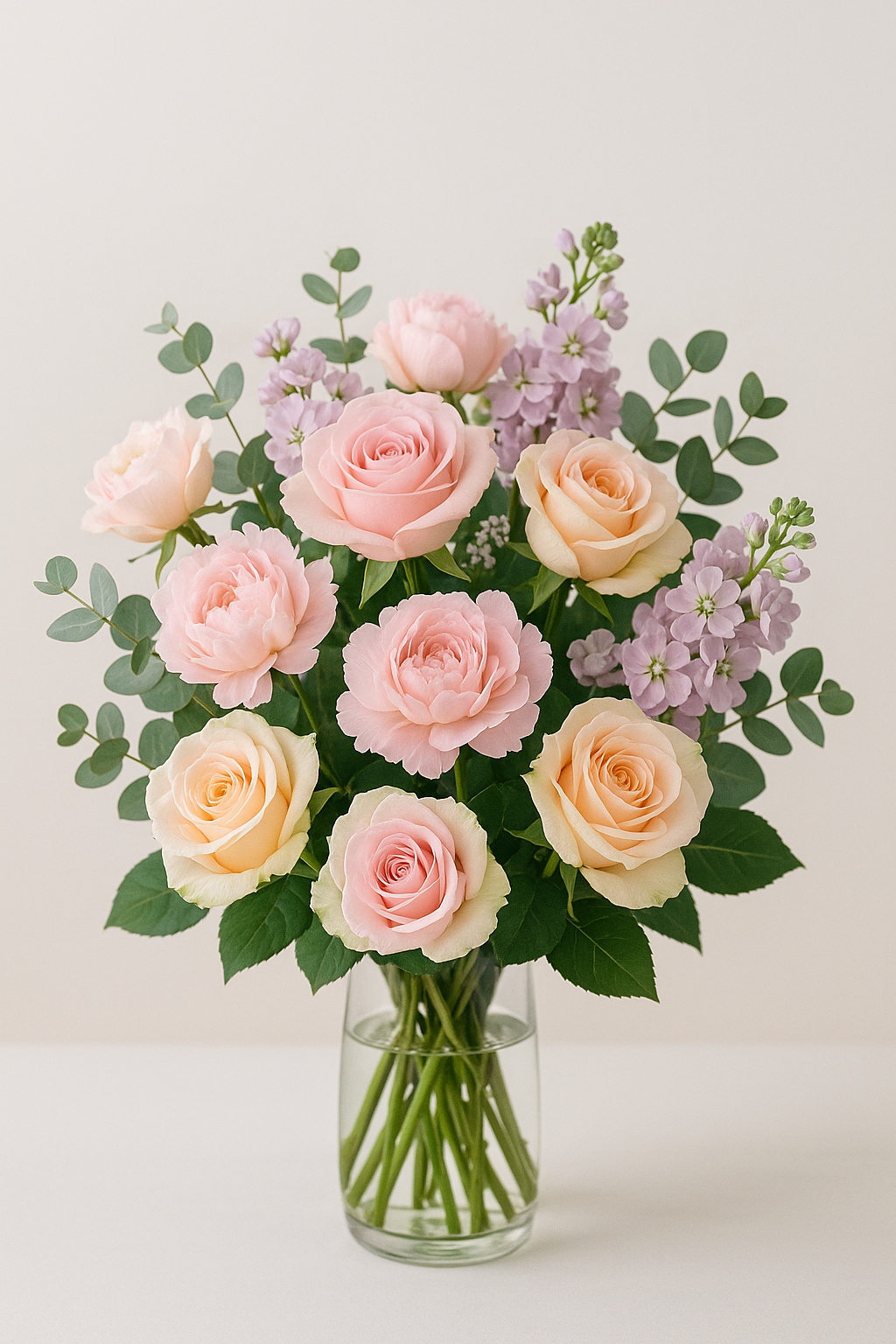 An elegant bouquet featuring soft blush pink and peach roses, garden-style ranunculus, and delicate lavender stock. The arrangement is balanced with fresh eucalyptus foliage in a sleek clear glass vase, offering a refined and romantic appearance.