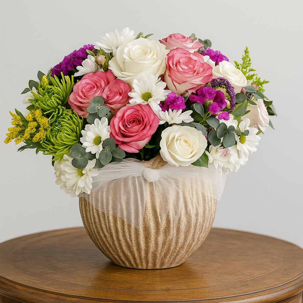 This joyful bouquet overflows with a radiant mix of white and blush roses, vibrant pink roses, lime green spider mums, classic daisies, purple statice, and touches of eucalyptus. All arranged in a textured beige ceramic vase wrapped delicately with soft tulle, this arrangement brings a refreshing pop of color and elegance to any room.