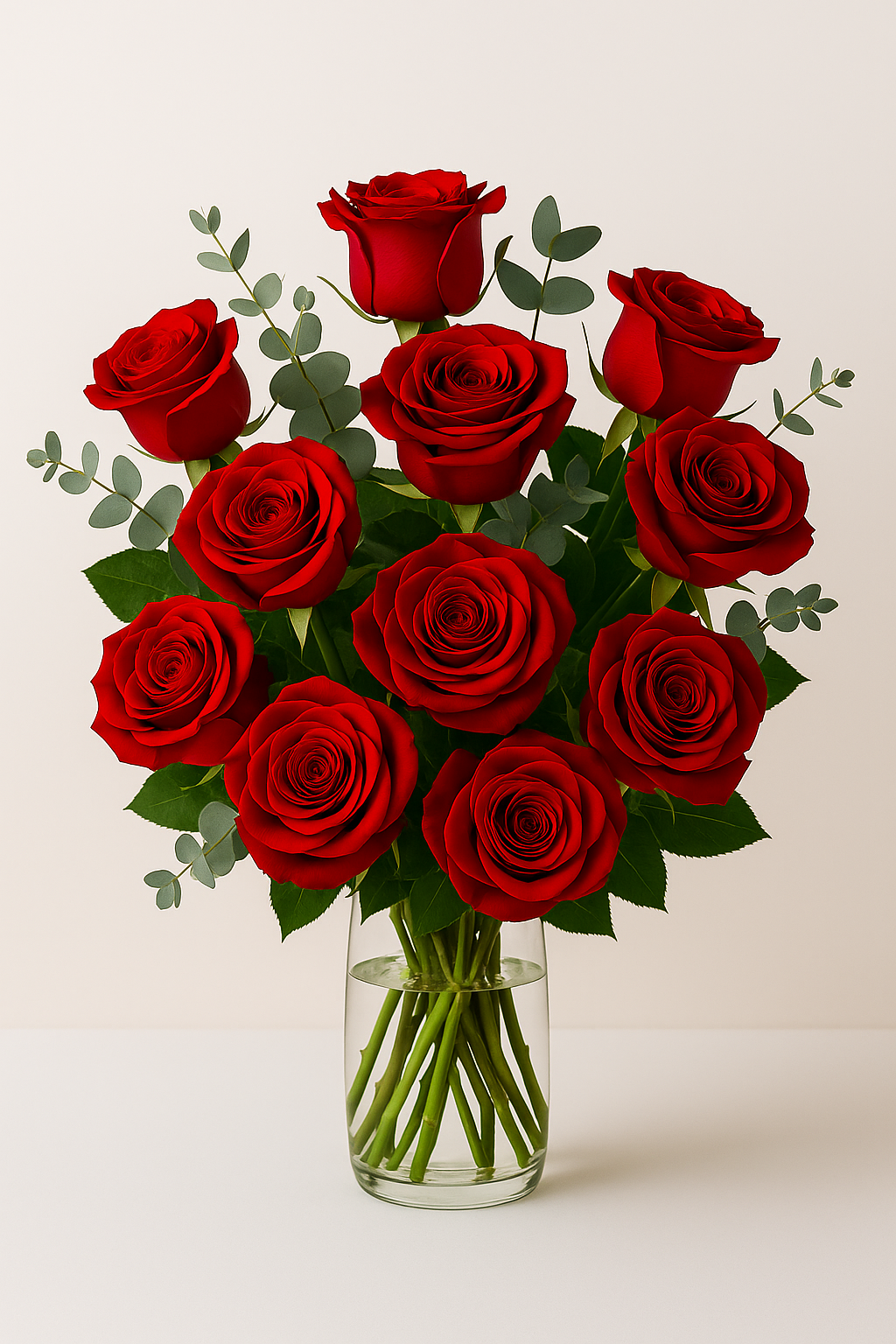 Celebrate love, passion, and timeless elegance with Classic Crimson, a stunning arrangement of 12 premium long-stemmed red roses nestled in lush greenery and stylish eucalyptus. Expertly arranged in a clear glass cylinder vase, this bouquet embodies romance and sophistication — perfect for making a lasting impression.