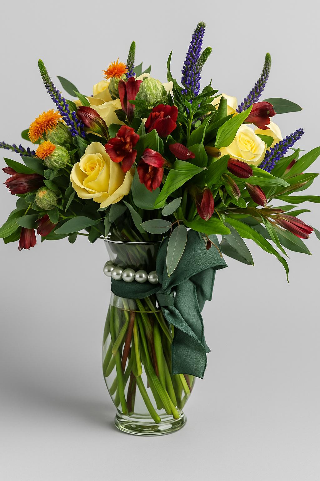 A striking and bold composition featuring rich burgundy alstroemeria, cheerful yellow roses, vibrant safflower blooms, and elegant purple veronica spikes. The greenery is lush and abundant, all gathered in a classic clear vase adorned with a pearl accent and deep green satin ribbon for a refined finish.