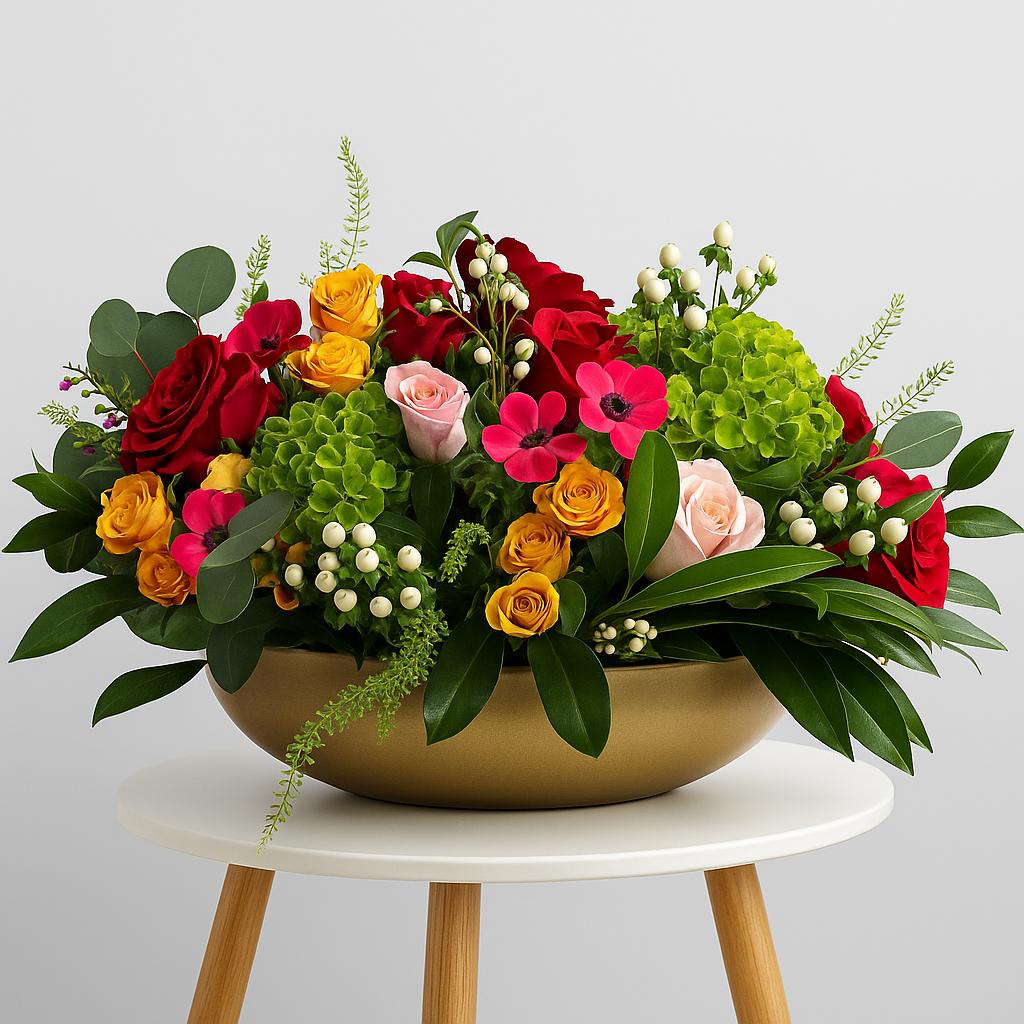 A lively and bold floral centerpiece featuring a harmonious mix of red, hot pink, blush, and yellow roses, bright green hydrangeas, pink anemones, white hypericum berries, and lush foliage. Arranged in a matte gold shallow bowl, this display strikes a balance between luxury and cheerful energy, perfect for commanding attention in any room.