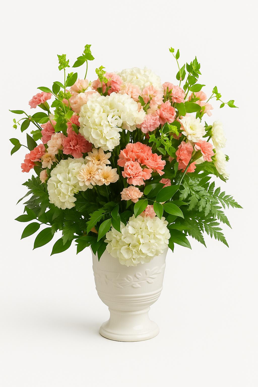 An elegant and classic arrangement featuring soft white hydrangeas, delicate peach and coral carnations, ivory alstroemeria, and assorted greenery. The flowers are arranged in a traditional ivory pedestal vase with embossed detailing, giving it a refined and timeless look.