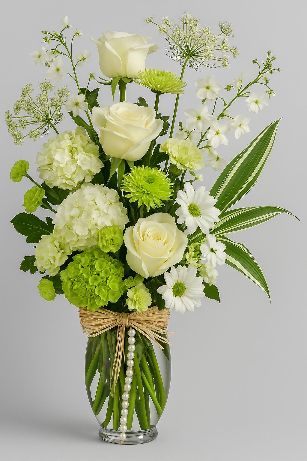 An elegant vertical floral arrangement featuring ivory white roses, soft green carnations, hydrangeas, and dainty daisy pompon. Delicate Queen Anne’s lace and linear greenery add height and grace. Tied with rustic raffia and accented by a cascading string of pearls, all in a clear glass vase, this design blends charm and sophistication.