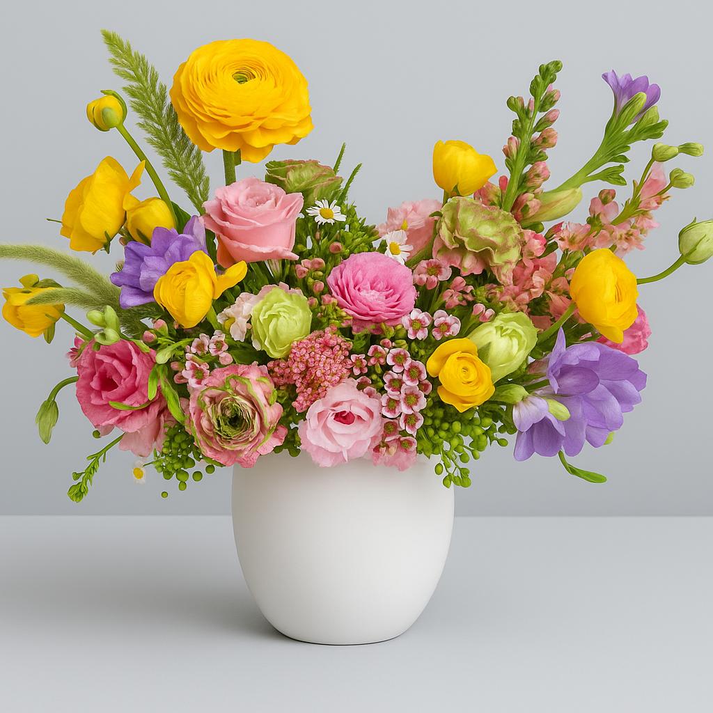 A lively, garden-style arrangement bursting with springtime joy. This bouquet features a vivid mix of yellow ranunculus, blush and hot pink lisianthus, soft green buds, lavender anemones, peach snapdragons, pink waxflowers, and delicate chamomile daisies, all styled in a matte white ceramic vase with a rounded modern shape.