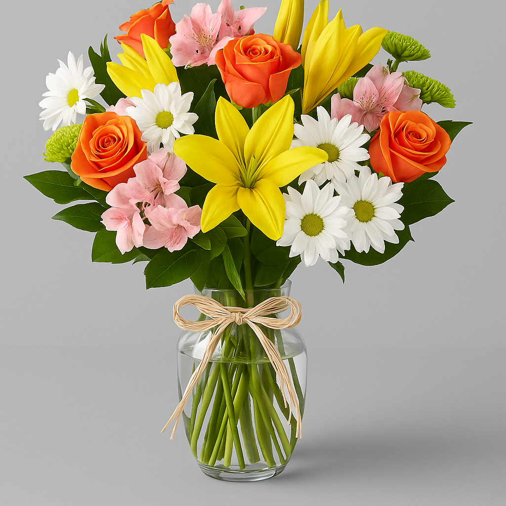 A cheerful medley of bright yellow lilies, vivid orange roses, classic white daisies, soft pink alstroemeria, and vibrant green poms. Arranged in a clear glass vase tied with rustic raffia, this design radiates joy and charm.